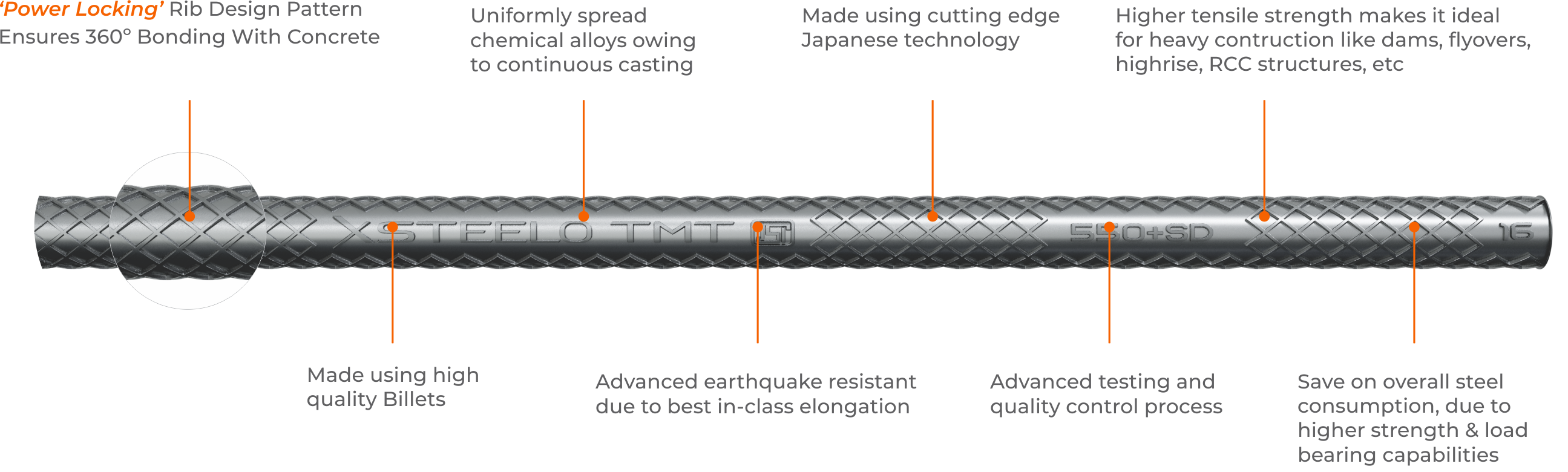 Xsteelo 550+SD EQCR TMT bars are ideal for every kind of construction. Be it heavy construction like Flyovers, bridges, skyscrapers, dams, high rises, cement silos, highways, etc or domestic construction like houses, showrooms, flats, group housing, etc. XSteelo TMT bars adds extra grip and strength to the foundation due to its specially design 360º ‘Power Locking’ rib design pattern.